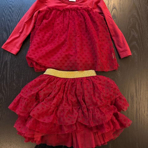 14 plagg. 2 skjørt, 2 strømpebuker hvor en er i ull, to jumpsuiter og 8 kjoler. Alt fra 90-104.