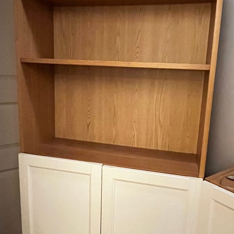 Høyskap med kombinasjon av åpne hyller og skap med dør. Passer til bruk i gang, stue, kjøkken eller bod for lagring av tekstiler, servise, bøker eller annet utstyr.