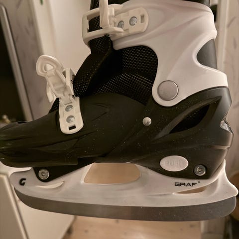 Graf ishockeyskøyter for barn i størrelse 34. Skøytene har svart og hvit yttersko med justerbare spenner for enkel tilpasning. Bladet er egnet for ishockeybruk på isbaner. Passer til barn som trenger stabile skøyter til trening eller lek på isen.