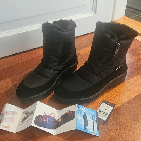 Brukt kun to ganger! Varme isolerende vintersko. Vendbare brodder fra OC-system som gir godt grep på isen. Glidelås på siden gjør skoene enkle å ta av og på.