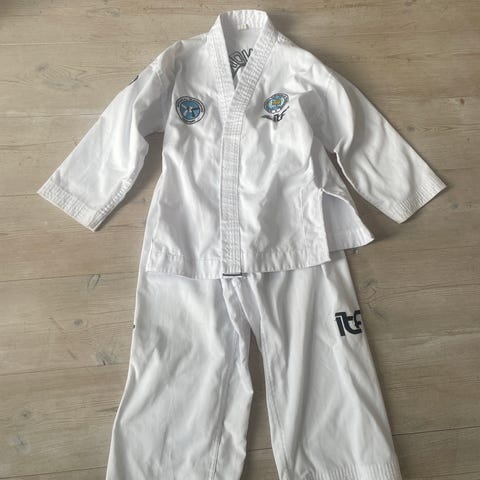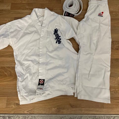 Kyokushinkai karate gi for barn i størrelse 130. Drakten består av hvit jakke med Kyokushinkai-logo, hvit bukse med stramming i livet og hvitt belte. Egnet til kampsporttrening, spesielt karate. Materialet er vevd stoff tilpasset bevegelse og bruk i dojo.