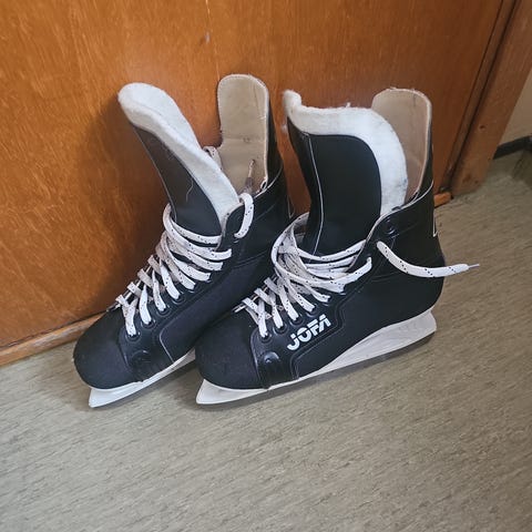 Jofa 150 ishockeyskøyter i størrelse 37. Modellen er svarte med hvite lisser og hvite skøytestål. Overdelen er i syntetisk materiale med polstret innside for økt komfort rundt ankel og fot. Skøytene har snøring foran for justering av passform. Egnet til ishockey og generell bruk på is.