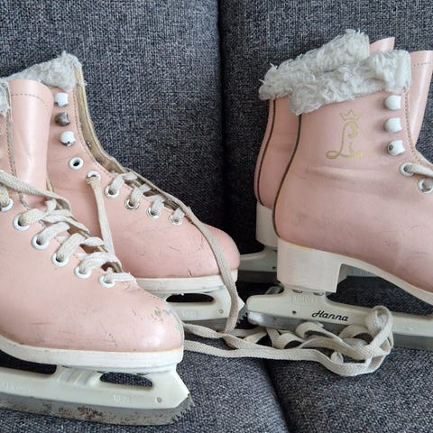 Ukjent merke barne skøyter i størrelse 32. Modellen er rosa med hvite detaljer og snøring foran. Skøytene har myk, pelsfôret kant øverst for ekstra komfort rundt ankelen. Passer til barn som trenger en enkel skøyte til generell skøytebruk på isbaner.