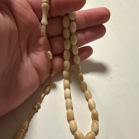 Rosenkrans med ovale treperler som er i lys nyanse ( malt) Kjedet avsluttes med et kors som anheng. Egnet til personlig andakt, bønn eller som dekorativt religiøst symbol. Kan være lurt å lakkere over med blank lakk om man vil beholde pantinaen som den er.