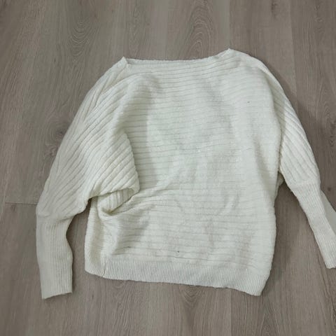 Va Vite genser for dame i størrelse M. Genseren er beige og laget i bomull. Modellen har bred ribbestrikket kant øverst som kan brukes som en bred hals eller skulderparti, samt ribbestrikk nederst og på ermene. Passer til hverdagsbruk og kan kombineres med både bukser og skjørt.