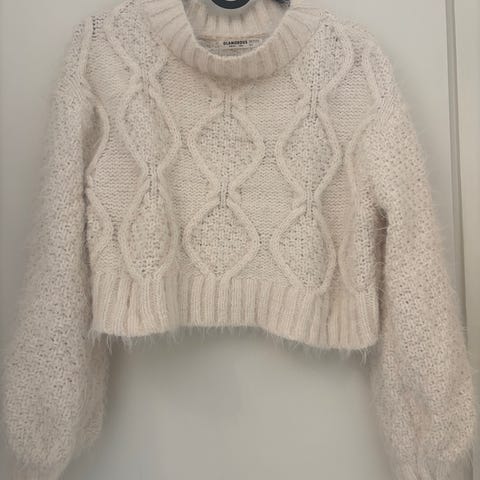 Cropped strikkegenser med fletter og knyting på den ene siden.