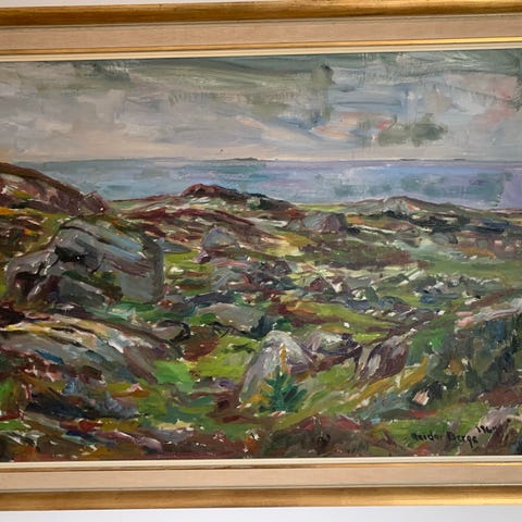 Maleri landskapsmotiv med fjord og fjell i ramme