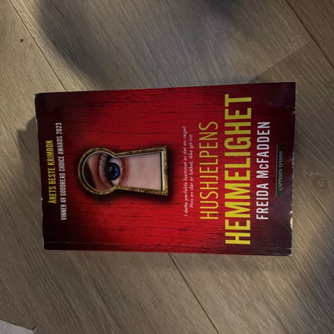 Freida McFadden Den låste døren bok på norsk. Pocketutgave utgitt av Cappelen Damm. Norsk oversettelse av spenningsroman/thriller. Boken har rød forside med tittel i gult og forfatterens navn øverst. Tekst på bakside er på norsk med kort handlingsreferat og informasjon om forfatteren samt strekkode og forlagslogo nederst.