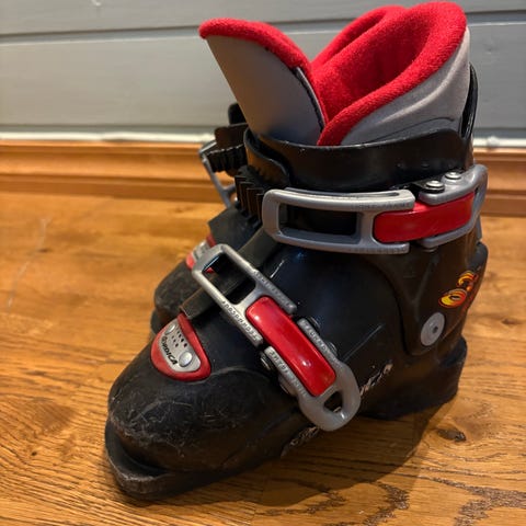 Alpina barne alpinstøvler i svart farge. Støvlene har to spenner foran for justering og god passform. Myk og polstret innersko i grått tekstil gir komfort og støtte. Egner seg til alpint og skikjøring for barn. Bak på støvlene er det en enkel dekor med figurmotiv. Størrelse 33
