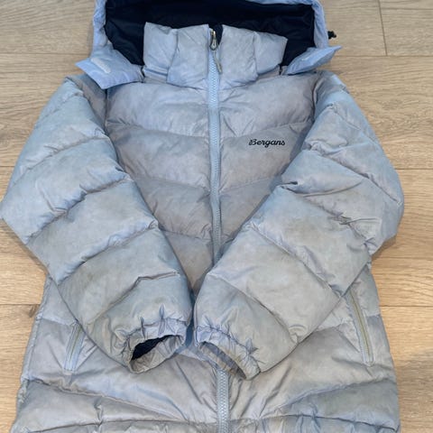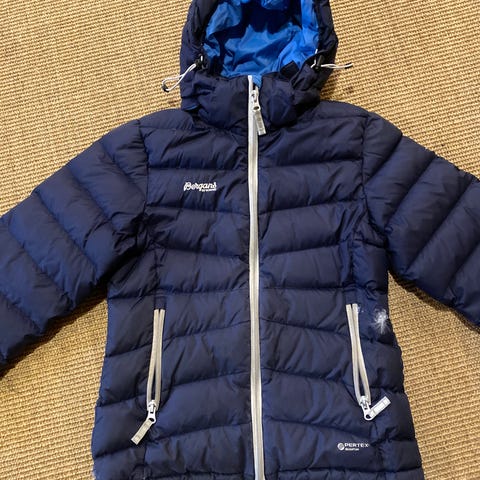 Bergans dunjakke for barn, unisex, i størrelse 140. Jakken er blå og fylt med dun, som gir god isolasjon. Modellen har høy krage og glidelås i front, samt flere glidelåslommer. Egnet som ytterjakke i kjølige og kalde perioder.