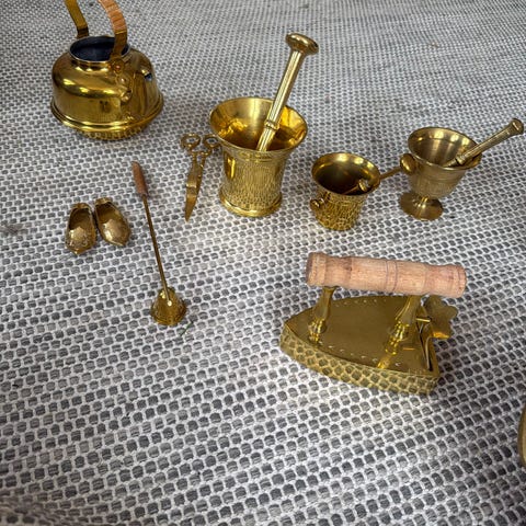 Selger en nydelig samling av 6 massive messinggjenstander. Disse er ekte, tunge og solide kvalitetsting med en fantastisk patina.