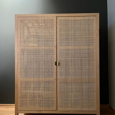 Meget godt brukt skap fra Søstrene Grene trenger nytt hjem. Treverk i furu, og dører av rotting. Det er ingenting strukturelt galt med skapet, men vår minst oppdragne katt har tidvis brukt hjørnene som klorestativ. Rottingen trenger også litt kjærlighet for å få tilbake originalglansen. Kjøpt mot slutten av 2020 og brukt siden. Er du en DIY-er og liker å pusse, fikse, eller male søker dette skapet deg!