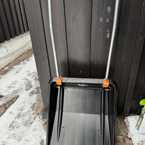 snøskuffe i svart plast med metallkant foran. Utstyrt med bredt blad og bøylehåndtak for å skyve og samle snø på gårdsplass, innkjørsel eller andre flater. Lett konstruksjon som gjør den enkel å håndtere og oppbevare når den ikke er i bruk.