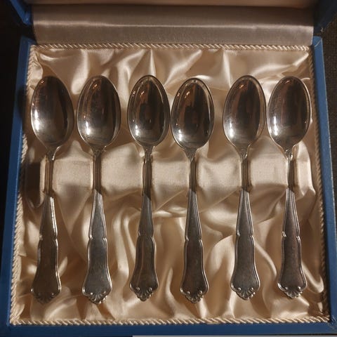 A. Frisch 6 stk skjeer Ca. 12 cm lange i eske sølv
