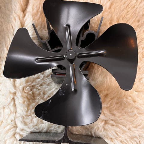 Vifte til vedovn i svart metall. Viften plasseres oppå ovnen og har tre blader. Egner seg til å sirkulere varm luft i rommet når ovnen er i bruk. Nøytralt, moderne design som passer til de fleste typer vedovner og interiørstiler.