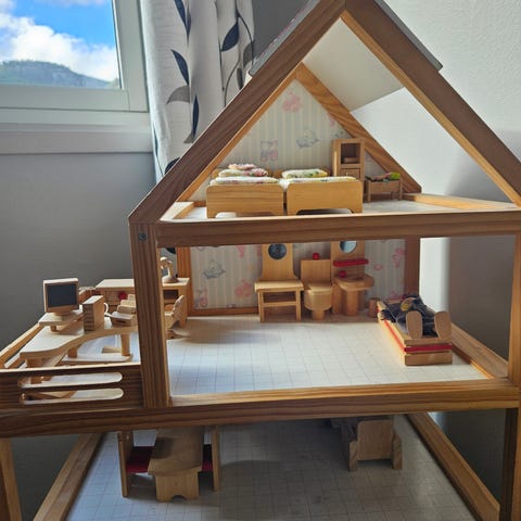 Flott lekehus i tre, med inventar