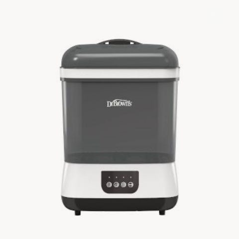Dr. Brown’s elektrisk flaskesterilisator i hvit og grå plast. Enheten har avtakbar beholder med lokk og innsats, og brukes via kontrollpanel på fronten. Sterilisatoren er beregnet for rengjøring og sterilisering av tåteflasker og tilbehør ved hjelp av damp. Leveres med strømkabel festet til basen. Egnet for husholdningsbruk til babyutstyr som tåteflasker, smokker og lignende smådeler som tåler dampsterilisering.