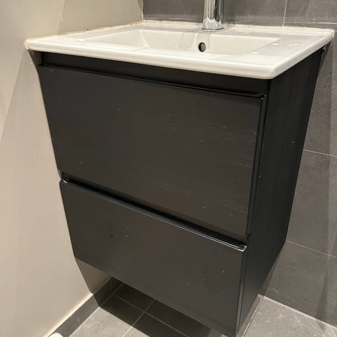 Baderomsinnredning med rektangulær servant på benkeplate og underskap med to store skuffer. Servanten er i hvit keramikk, mens innredningen har mørk front og lys treinnside i skuffene. Skuffene gir god oppbevaringsplass til baderomsartikler. Det følger med servantbatteri montert på benkeplaten, slik det vises på bildene. Egnet for montering på bad der det er behov for kombinert servant og oppbevaringsløsning.
