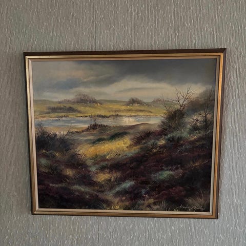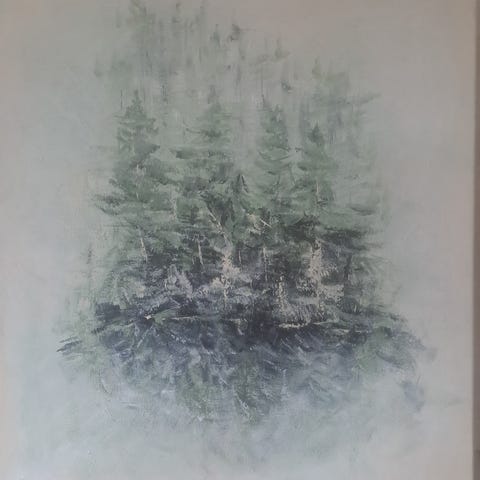Maleri skogmotiv lilla, grå og svart. 50×61.