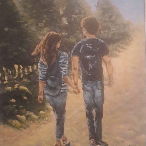 Maleri med skogmotiv i abstrakt stil. Bildet viser trær og skogbunn i hovedsakelig lilla, svart og gråtoner, med innslag av lysere partier som gir dybde i motivet. Maleriet passer som veggdekor i stue, gang eller andre oppholdsrom. Nærbildene viser struktur og penselstrøk i overflaten. Størrelse 50×61, akryl, lerret.