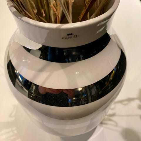 Kähler Omaggio vase i keramikk. Vasen har hvit glasert overflate med horisontale striper. Egnet til snittblomster, grener eller tørkede blomster, og kan brukes som dekorasjon på bord, hylle eller vinduskarm i ulike rom i hjemmet.