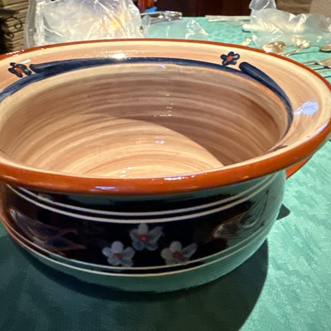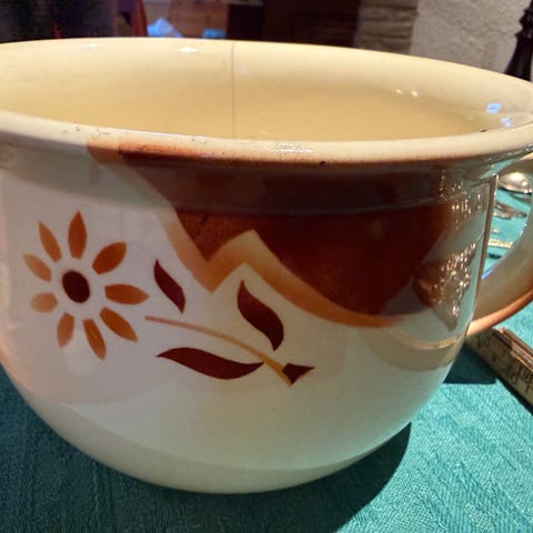 Brødrene Pedersen potte med hank i keramikk. Potten er hvit med håndmalt blomsterdekor i blått og gult samt blå kantdetaljer på hank og kant. Egner seg som dekorativ gjenstand eller til praktisk bruk etter behov.