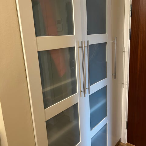 Vitrineskap i kombinasjon med glass i grei stand. Den står i garasjen på flat, jeg kan hjelpe med henting.