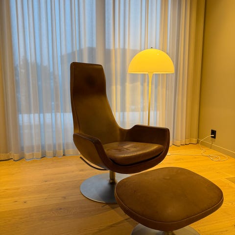 Lenestol med regulerbar rygg, puff og ryggpute.
