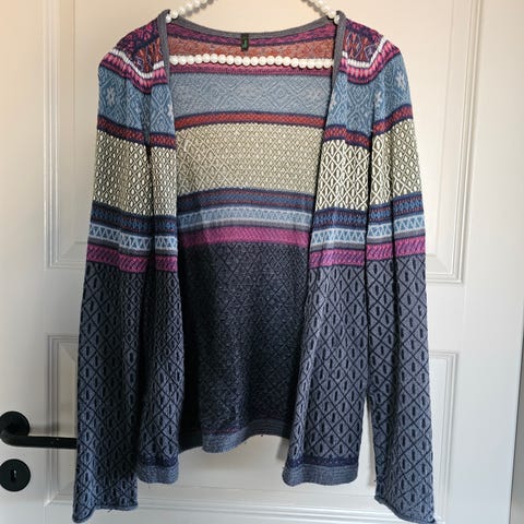 Benetton cardigan for dame i størrelse M. Cardiganen er grå og laget av 100 % ull. Modellen har rund hals og knepping med knapper foran. Passer som et lag over topp, skjorte eller kjole i hverdagen eller på jobb.