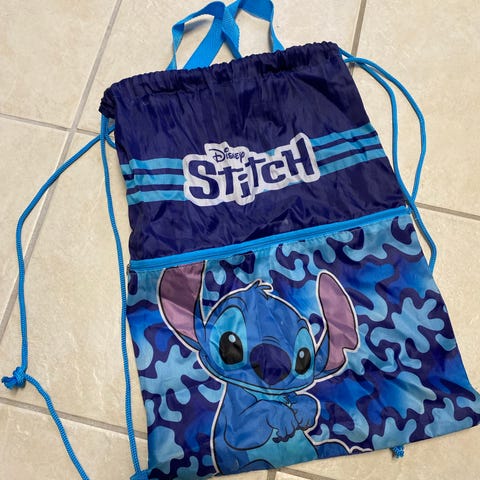 Disney Stitch bag i stoff for barn. Vesken har et rosa og flerfarget mønster med Stitch-motiv på siden. Den har to korte bærehåndtak og en justerbar skulderrem i mørk kontrastfarge. Hovedrommet lukkes med glidelås og innvendig er det et mindre glidelåsrom for oppbevaring av småting. Egnet som liten treningsbag, til badeland eller hverdagsveske.