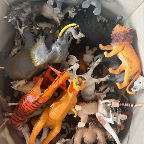 Figurer fra husdyr, dyr i Afrika og dinosaurer. Kan ikke se noe slitasje på de, de er så og si aldri lekt med da interessen ikke har vært der.