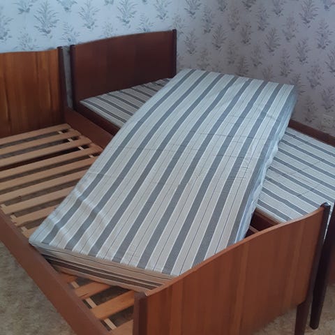 2 stk retro 70-talls senger med madrasser og ingen knokket planker. Madrassene er i veldig god stand til alder.