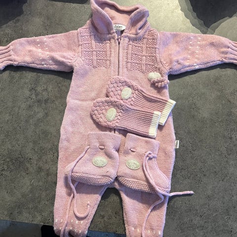 Lillelam dress med lue, votter, hals og labber. Dressen er brukt mer en alt tilbehør, men fortsatt fin.