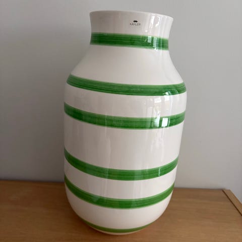 Kähler vase i keramikk med rosa og hvite horisontale striper. Vasen har klassisk rund form med smalere åpning øverst. Glassert overflate. Egnet til dekorasjon og til å sette blomster i. Merking med Kähler-logo under og på siden av vasen. Vasen har en liten skramme på den ene siden (se siste bilde).