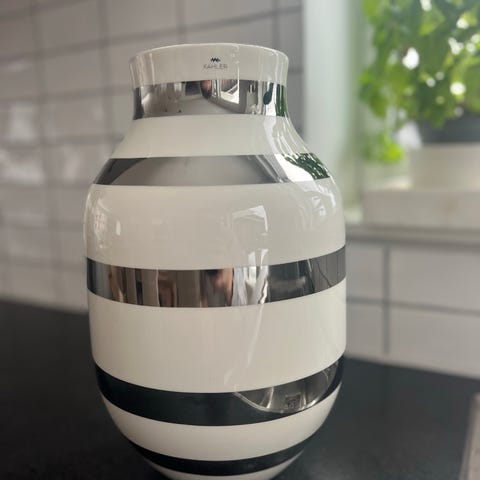2 stk Kähler vaser i keramikk med stripet design i hvit og sølv. Vasen har en rund form med smalere åpning øverst, egnet til snittblomster, tørkede blomster eller dekorative greiner. Passer som borddekorasjon eller som del av en større interiørgruppe i stue, kjøkken eller gang.