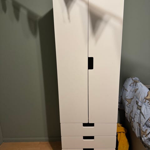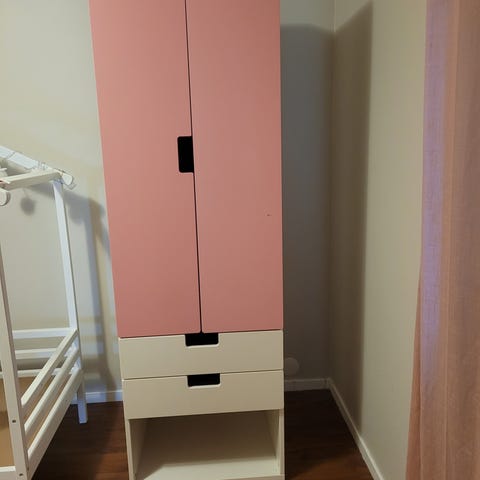 IKEA klesskap til barnerom i rosa og hvit. Skapet har to dører øverst og tre skuffer nederst. Innvendig er det en hylle øverst og plass til oppbevaring under. Passer til oppbevaring av barneklær, leker og annet utstyr på barnerommet. Overflate i malt tre/plateverk med glatte fronter og integrerte håndtak.