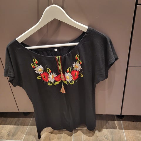 Veldig pent t- skjorte med ornament. St. S. Noen ganger brukt. Ingen slitasje.