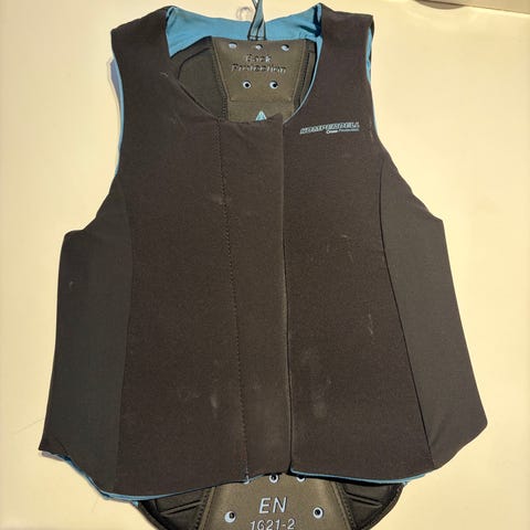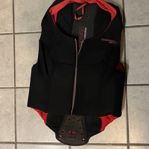 Komperdell Cross Protection ryggskinne vest i størrelse M. Vesten har integrert ryggplate med ventilasjonshull og elastisk tekstil rundt, med svart utside og blå innside. Glidelåslukking foran gjør den enkel å ta av og på. Ryggbeskyttelsen er CE-merket og beregnet for bruk utenpå et tynt baselag. Egnet som ryggbeskyttelse ved aktiviteter som ski, snowboard, ridning eller annen idrett der ekstra beskyttelse for ryggen er ønskelig.
