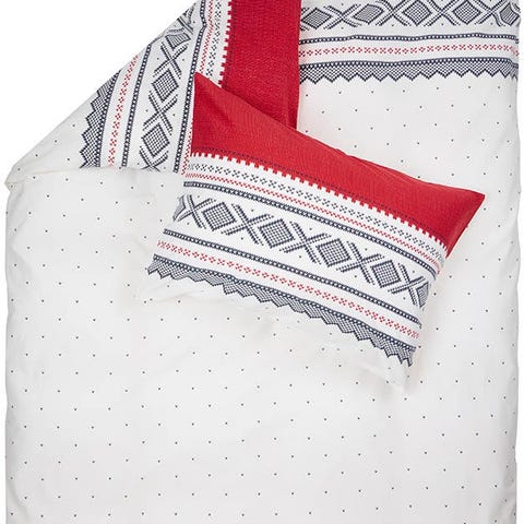 H&M Home sengesett i hvitt med røde sløyfedetaljer og tilhørende fitted laken. Dynetrekket har brodert bølgekant med sløyfer langs kanten, mens putetrekket har matchende sløyfemotiv. Tekstilet har gjennomgående små røde sløyfer som mønster. Passer til soverom der man ønsker et enkelt, lyst sengesett med dekorative detaljer. Laken med små røde sløyfer.