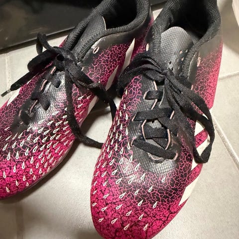 Adidas fotballsko i størrelse 38. Skoene har svart overdel med hvite detaljer og rosa såle og innside. Knottemønsteret er tilpasset spill på kunstgress eller grus. Lukkes med lisser for justerbar passform.