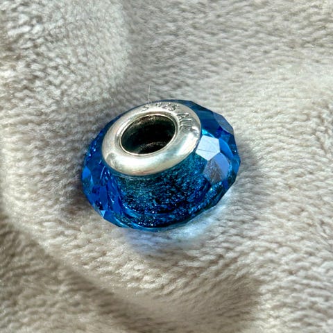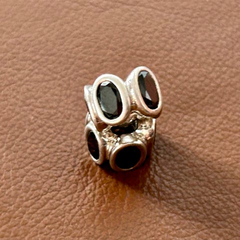 Svært pent brukt, utgått, Pandora charm i nydelig, svart, fasettslipt muranoglass. Kjerne i 925S sølv med Pandora-logo og stemplet 925S ALE på andre siden, som er autentiseringstempelet til Pandora. Passer til Pandora-armbånd og andre kompatible smykke-systemer, eller vanlig kjeder.