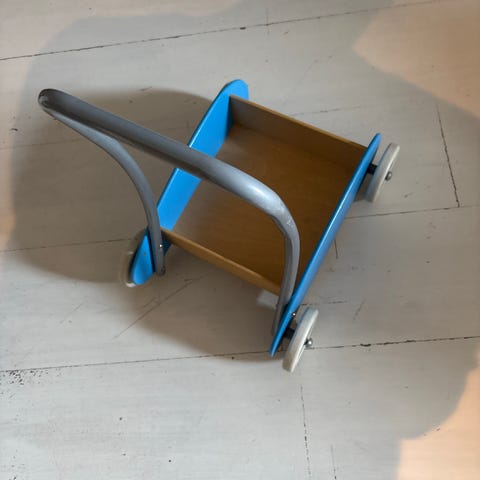gåvogn i tre med blå sider. Vognen har metallhåndtak og fire hjul i plast. Egnet som støtte når små barn skal øve på å gå, og som lek.