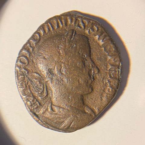 En pen dupondius med keiser Trajan. Mynten veier 8,95g og diameteren er 25mm.