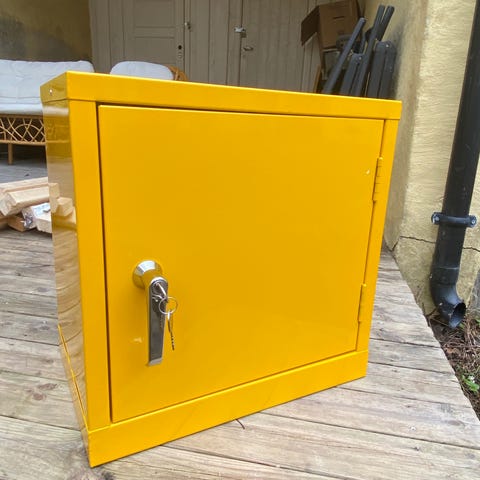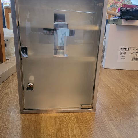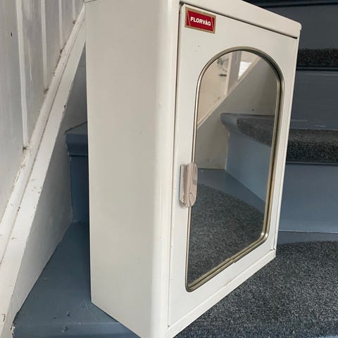 Vintage skap med lås hvitlakkert metall. Både selve skapet og døra har tre faste hyller. Kan brukes som medisinskap eller på kjøkken til krydder? Baksiden har ferdige hull for veggmontering, og kan henges opp både som høyre- og venstrehengsla skap. Noen merker, men kult i eit vintage interiør.