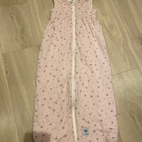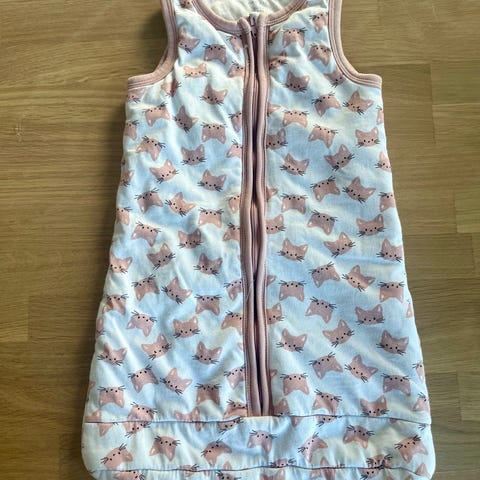 Størrelse 3-18 måneder. Gir en jevn temperatur gjennom hele natten. Tilpasset seler og kan brukes i vogn, bilstol og matstol. To-veis glidelås. Ca lengde 80 cm. Usikker på tog da lappen er falmet, men tror den er på 2. «Gammel ny versjon» uten strikk stramming i livet. Er vasket, men har litt misfarging rundt hals, ingenting å si for bruk. Fargen er lyserosa med blomster. Ønsker 300 kr.