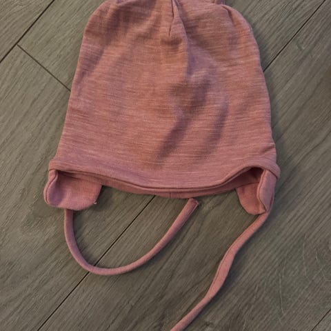 Name it lue for barn i størrelse 44. Luen er rosa og laget i bomull. Unisex-modell med øreklaffer og knyting under haken. Pyntedusker på toppen og lite merke foran.