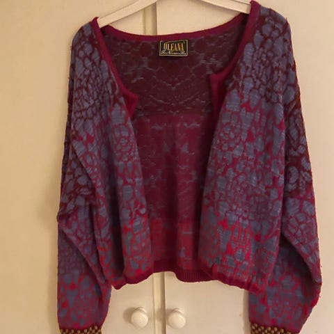 Oleana cardigan i ull for dame i størrelse S. Jakken er rød med mønstret strikk og kontrastdetaljer langs åpningen og nederkant. Kort modell med lange ermer. Laget i ull som gir god varme og egner seg til bruk både inne og ute, alene eller over andre plagg. Finner ikke noen mangler eller synlig slitasje.