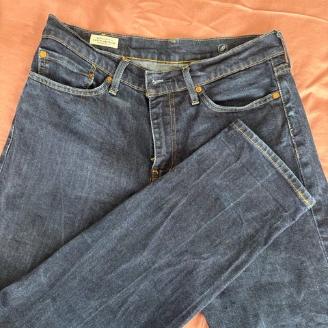 Levi’s 511 jeans i blå denim. Modellen er en smal passform med klassisk femlommers design, gylf med glidelås og knapp i livet. Størrelse W30 L32. Materialet er tradisjonell denim i bomull med typiske Levi’s-detaljer som skinnlapp bak i linningen og rød logoetikett på baklommen. Passer som hverdagsbukse.