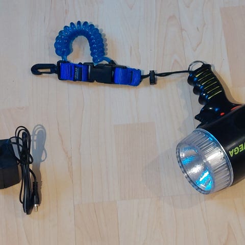 Kraftig oppladbar dykkerlykt med tilbehør.