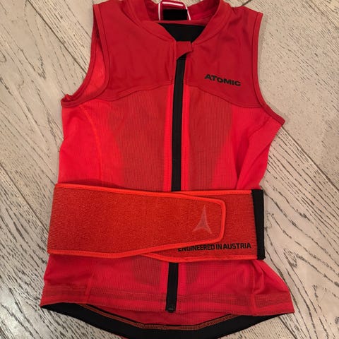 Atomic Live Shield ryggbeskytter vest i rød farge. Vesten har integrert ryggplate og elastisk midjebelte med borrelås for justering og stabilitet. Glidelås i front gjør den enkel å ta av og på. Egnet som beskyttelse ved ski- og snowboardkjøring eller andre aktiviteter der ryggbeskyttelse er ønskelig.